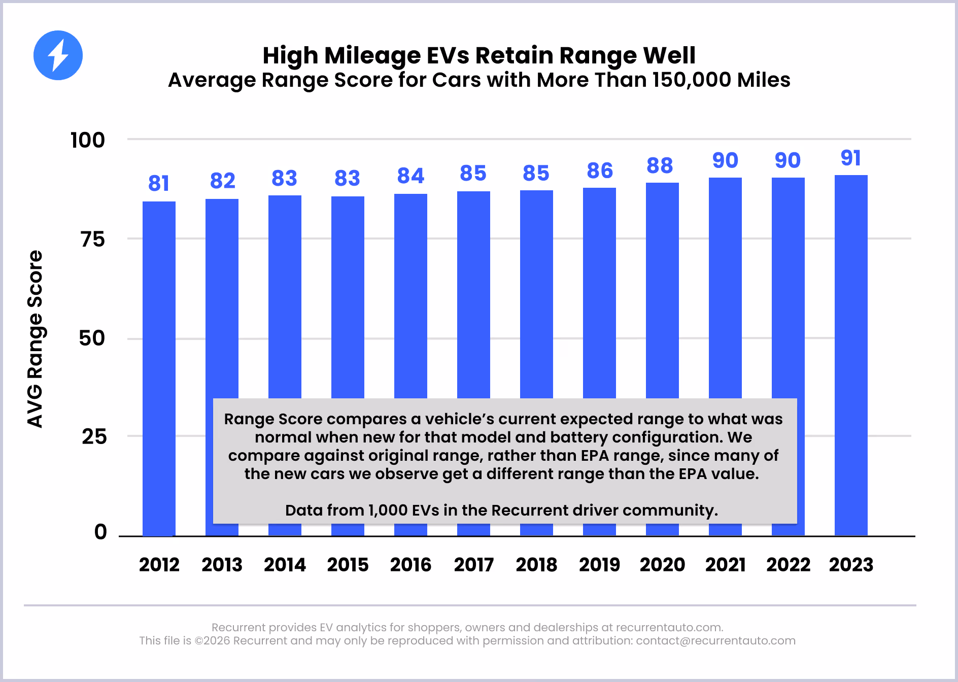 Most electric cars are maintaining their range longer than people expect. Even vehicles with over 150,000 miles hold up remarkably well. Modern EVs have a battery replacement rate of just 0.3%.