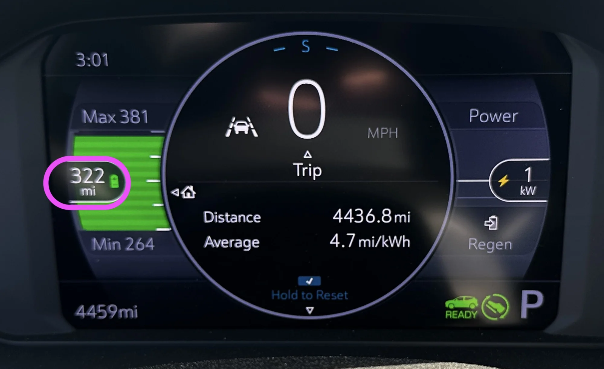 This trip efficiency of 4.7 mi/kWh is for the current trip. This number works differently than the left-hand range predictor we talked about above, which uses driving conditions for the previous 20-50 miles (although the exact calculation is unknown). The range predictor updates pretty frequently, especially on long trips, while the trip efficiency will recalculate only when you reset the trip. This can cause a bit of a mismatch sometimes. In the example, the battery is roughly 95% charged, putting the estimated efficiency closer to 5.1 miles/kWh (322 miles divided by battery capacity of approximately 62.7 kWh)