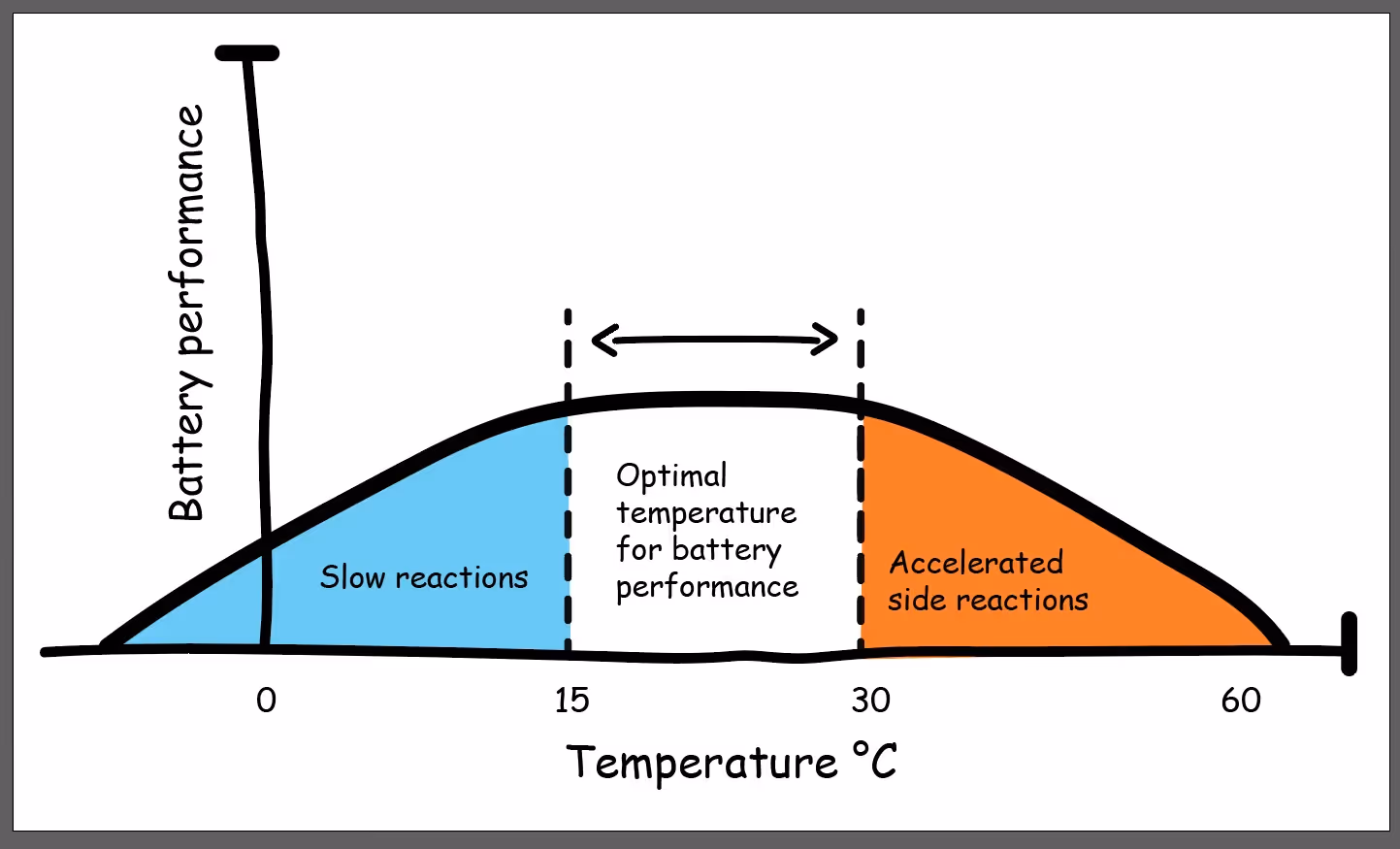 There is a minimum energy threshold needed for any reaction to take place. At higher temperatures, individual particles move faster, or have higher kinetic energy. This additional kinetic energy increases the number of molecules that meet the minimum energy threshold. In a battery, this means that it takes less additional energy to charge, or that you can discharge (e.g. turn an electric motor to move an EV) with additional power. Temperatures below the ideal operating temperature results in less kinetic energy, slower reaction times, and decreased power output. Similarly, temperatures above ideal operating temperature may lead to early degradation.