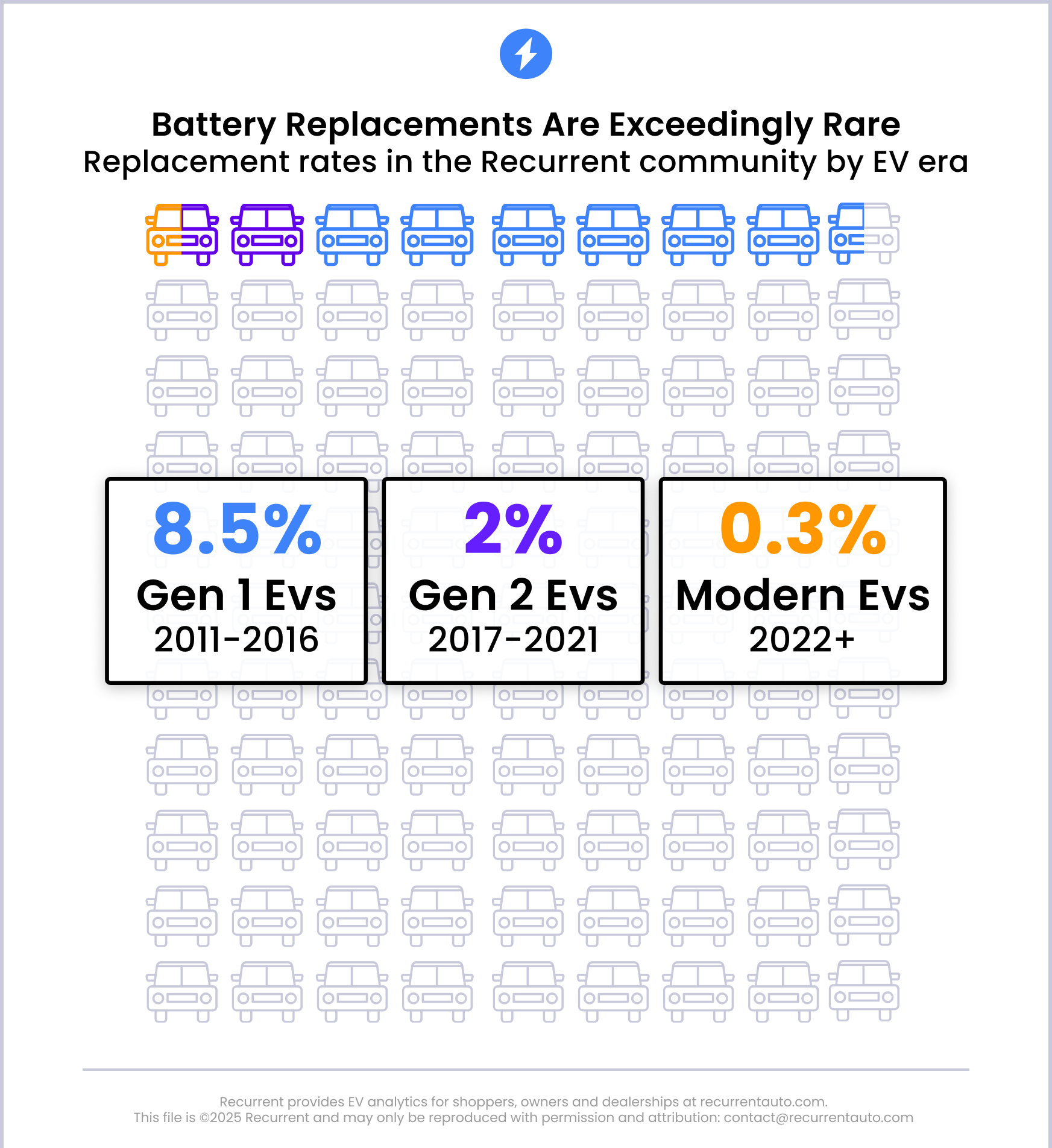 There have been two major battery recalls in recent years - in Chevrolet Bolt EVs and Hyundai Kona EVs. These were both due to defects in batteries from the same manufacturer, and replacements were covered by the automakers. Other than these two recalls, though, battery replacements in the Recurrent community remain rare.