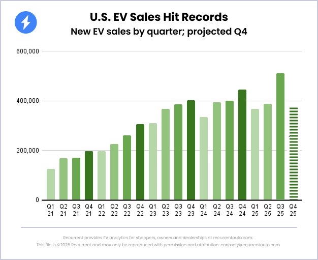 As of September 30, 2025, all federal tax credits for used, new, and leased electric vehicles ended. It was no surprise, then, that Q3 saw record sales for new and used PHEVs and BEVs. Total EV sales are at 10.36% through Q3 compared to 9.6% for 2024. The Q3 record beat the prior peak set in Q4 2024 by nearly 20%. September, the country’s strongest month of EV sales ever, saw 14% penetration in the new market.