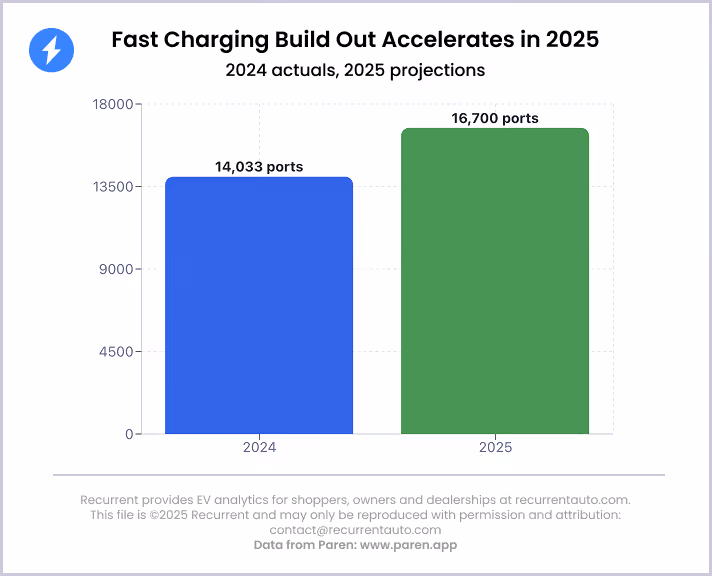 However, investment and build out of new ports has accelerated in 2025. Paren, a charging data aggregator and analytics company, estimates 17K new ports this year. On a baseline of 51,000 existing ports, this represents 33% growth. That is comparable to, but higher than, the 31% increase in EVs on the road over the year.